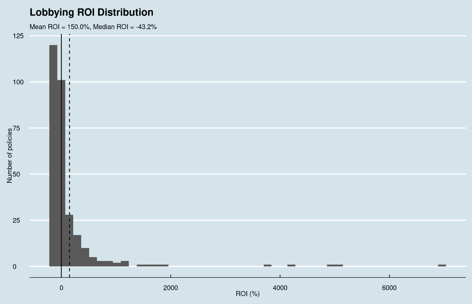 The analogy with venture capital is more than just a mental frame. It’s an empirical reality, known intuitively by seasoned practitioners and documented in top-tier economic research. Let’s look at some numbers: One of the most sophisticated studies on the economics of lobbying shows that lobbying improves the likelihood of an individual favorable policy being enacted (or an unfavorable policy not being enacted) by just half a percent on average. The effect is small because lobbying efforts often cancel each other out, and because each additional dollar faces diminishing returns, due to real-world constraints like competing priorities, institutional bottlenecks, and public opinion. And yet, despite that tiny average impact, the measured ROI is significant: between 140% and 156%.
